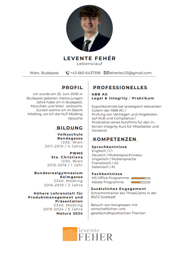 Meine Matura hab ich an der Höheren Lehranstalt Mödling (kurz: HLP Mödling) erlangen. Zurzeit studiere ich Wirtschaftsrecht an der Wirtschaftsuniversität Wien. Ich habe zahlreiche Praktika bei namhaften Unternehmen absolviert wie beispielsweise ABB Österreich, wo ich in der Legal&Integrity Abteilung rechtliche Aufgaben vorallem im Bereich der Vertragsprüfung und der Exportkontrolle durchführen konnte.